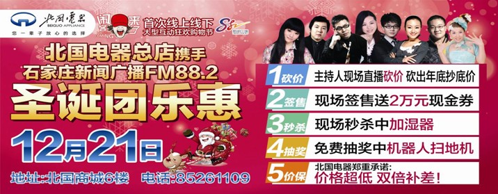 12月是个结束的月份,同时也意味着新的开始。在这个辞旧迎新的日子里,我们一起闹起来。除了12月21日北国电器总店圣诞团乐惠的盛大狂欢之外,北国电器自12月18日起至22日全场家电7折起售,闹客狂掀低价狂潮!百万特价闹全城!百万豪礼大闹全城购家电单台或累计满额送冬日大储物箱、上好佳大礼包、精美浴巾、光明日化大礼包、魔力拖把、鲁花花生油、北人通用卡等好礼。此外还有双线秒杀大闹全城——10元购买100元家抢鲜卡/ 9500元购买10000元家电抢鲜卡,超级大奖全城飞 100%中奖!北人会员积分抽奖得mini ipad/IPHONE5S/北人福礼卡 100%中奖,消积分还可以兑换福礼卡啦!12月18-22日持百货赠出的全业态通用卡在北国电器市区任意卖场购家电满额1:1配比现金使用(特例商品除外)。北国电器双线跨界大促——大闹全城,首次线上线下大型互动狂欢购物节!
