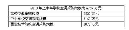 学校空调采购成为新的增长点。据统计,2013年上半年,学校空调采购规模为6757万元,其中,高校空调采购规模为2527万元,占学校采购规模的比重为37%;中小学校空调采购规模为3160万元,占比为47%;职业技术院校空调采购规模为1070万元,占比为16%。