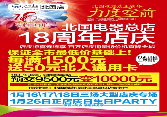 北国电器北国总店18周年大庆开幕啦!1月8-15日期间,到北国电器总店预交9500元就得10000元店庆现金卡,1月16日在北国电器总店购家电在所有活动基础上直抵现金使用!