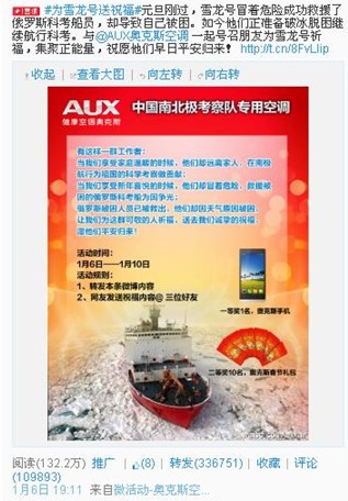 作为一家企业,奥克斯一直将南极的事业放在心中,在官方微博上,奥克斯空调一直在关注南极科考的信息,并且通过自己的努力传递给更多的人,为南极科考事业做出一份贡献。这次奥克斯空调第一时间通过微博发起“为雪龙号送祝福”活动,不仅是希望“雪龙”号早日脱困,继续科考任务,也是希望南极科考被更多人所关注,让祖国的科考事业不断进步。