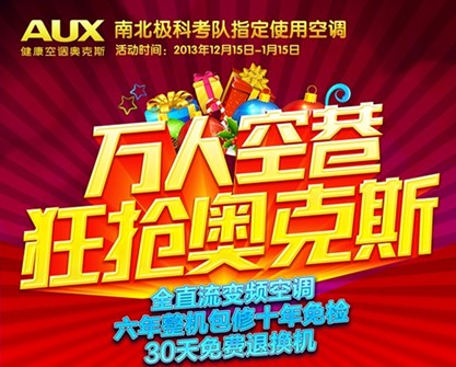 据了解,奥克斯的这次促销活动从2013年12月15日至2014年1月15日,具体内容涉及升值、礼品、折扣、降价、售后服务等几大方面,具体为预交20元定金,挂机抵100元,柜机抵200元;购VB、VMA机型,可享受捆绑特权,购任意款挂机可获代金券100元,任意款柜机获代金券200 元;购买指定机型最高直降2000元;全直流变频制热不满意,满足相关条件即可在30天内免费换新机。除此之外奥克斯为了迎合中国传统节日春节的到来,提前为消费准备了新春礼包,来奥克斯展厅扫“二维码”并转发个人微博或微信即得包括灯笼、福字在内的春节大礼包。