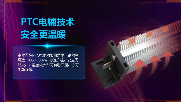 应用了PTC电辅技术,高效率可达1100-1200W,急速升温,在温差较大时可自动开启,也可通过手动操作的方式开启。强力制冷制热功能,可急速制冷制热,实现60秒风口降温10度的超强冰酷体验。采用IFT智能精确恒温技术,空间内每个角落都能享受同样的舒适。