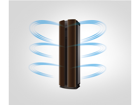 尊柜机出风方式采用正面和双侧面同时送风,搭配上下左右环抱式出风,可以实现大面积大风量送风,强劲冷暖控温快捷,而且使得温度均匀,达到多维立体出风,只制冷暖不吹人,提升用户使用舒适度,减少空调病的可能。