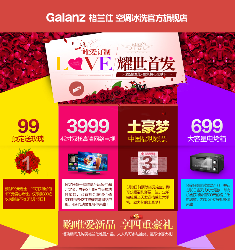 据了解,3月4日至8日期间,登录格兰仕空调冰洗官方旗舰店(链接:http://galanzkbx.tmall.com/shop/view_shop.htm?spm=a220m.1000862.1000730.2.Qh5Vca&user_number_id=1719298343&rn=40f8d453ae949ac548c368157732a792)购买格兰仕“唯爱”空冰洗产品,人人均可参与抽奖,赢取惊喜大礼,乐享格兰仕高规格礼遇:预付99元订金,即有机会获得价值99元爱心玫瑰;还有机会获赠福利彩票一注,向土豪梦想又迈近一步!预定任意一款“唯爱”产品,并在3月8日成功付清尾款,即有机会获得价值699元的格兰仕电烤箱或价值3999元的42寸双核高清网络电视。如此大批量元气满满的爱心赠品,令人咂舌!