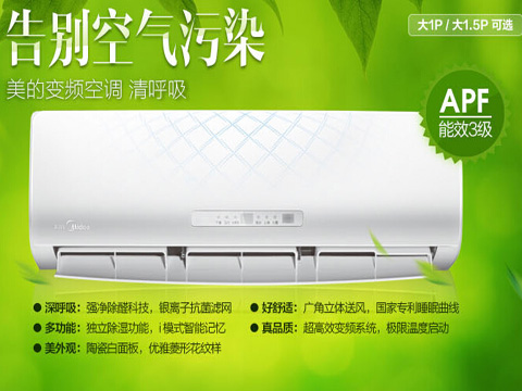 美的变频空调,清呼吸,告别空气污染。四大健康科技,轻轻松松深呼吸。