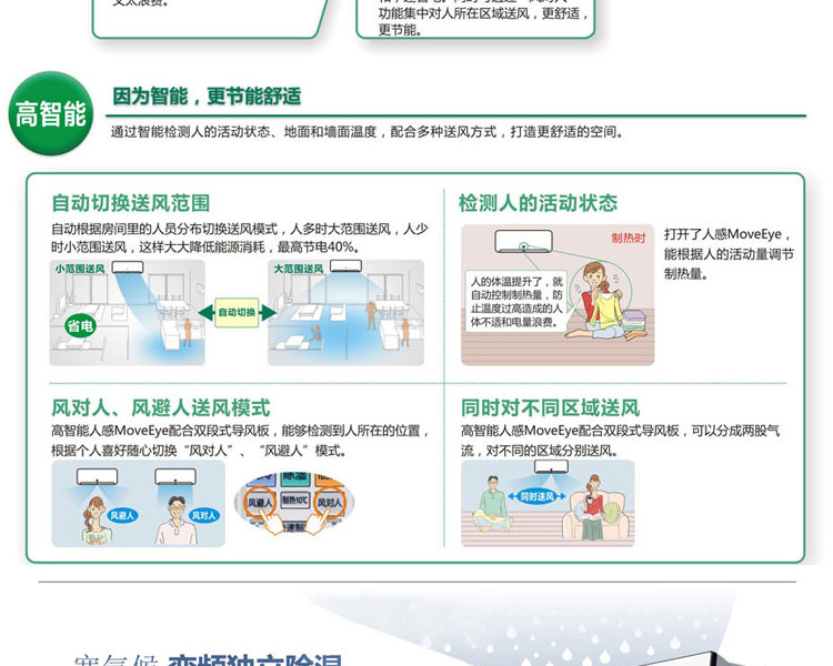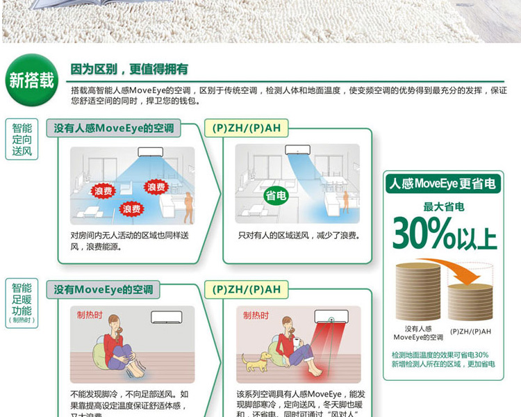 以往空调制冷时,由于冷气流沉积在地面附近,空调进风口温度比地面温度高,空调仍以高功率制冷运转,容易造成冷气流大量沉淀。高智能人感MoveEye在原有动态地面测温MoveEye的基础上进行了优化和改善,它内藏8个感应器,将探测到的房间立体空间分成752个区域检测使用者和地面的温度,并对其进行细致的分析,使空调的制冷、制热和送风更加精确,比普通空调节电约40%,实现极致的舒适和节能。