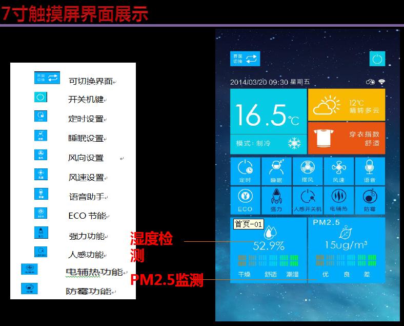 天枢具有云服务记忆功能,可以根据在后台的云端储存用户数据,能实时了解到空调的运行状况,在发生故障时能提醒用户,或排出工程师上门维修。更重要的是,能掌握用户的消费习惯,为无限贴近用户需求提供依据。北斗系列既拥有相同的优点,又拥有各自特有的长处,天枢独具的优点就是拥有7寸的LED触摸屏,屏面色彩鲜明,各种数值、提示一目了然,当记者用手指划过屏面时,感觉有平板电脑的质感。天枢不仅能够实时检测室内空气质量,当有害空气侵害时,自动为您开启净化功能,经过IFD净化装置,能够高效去除PM2.5,全方位呵护您和家人。而且,TCL智能空调独有的钛金芯,具有防尘、防霉、杀菌、除异味,自清洁几项功能,保证您在长期使用时不会有空气质量担忧,智能开机除甲醛,为你扫除新家中的顽固甲醛,让你早日住进新家。