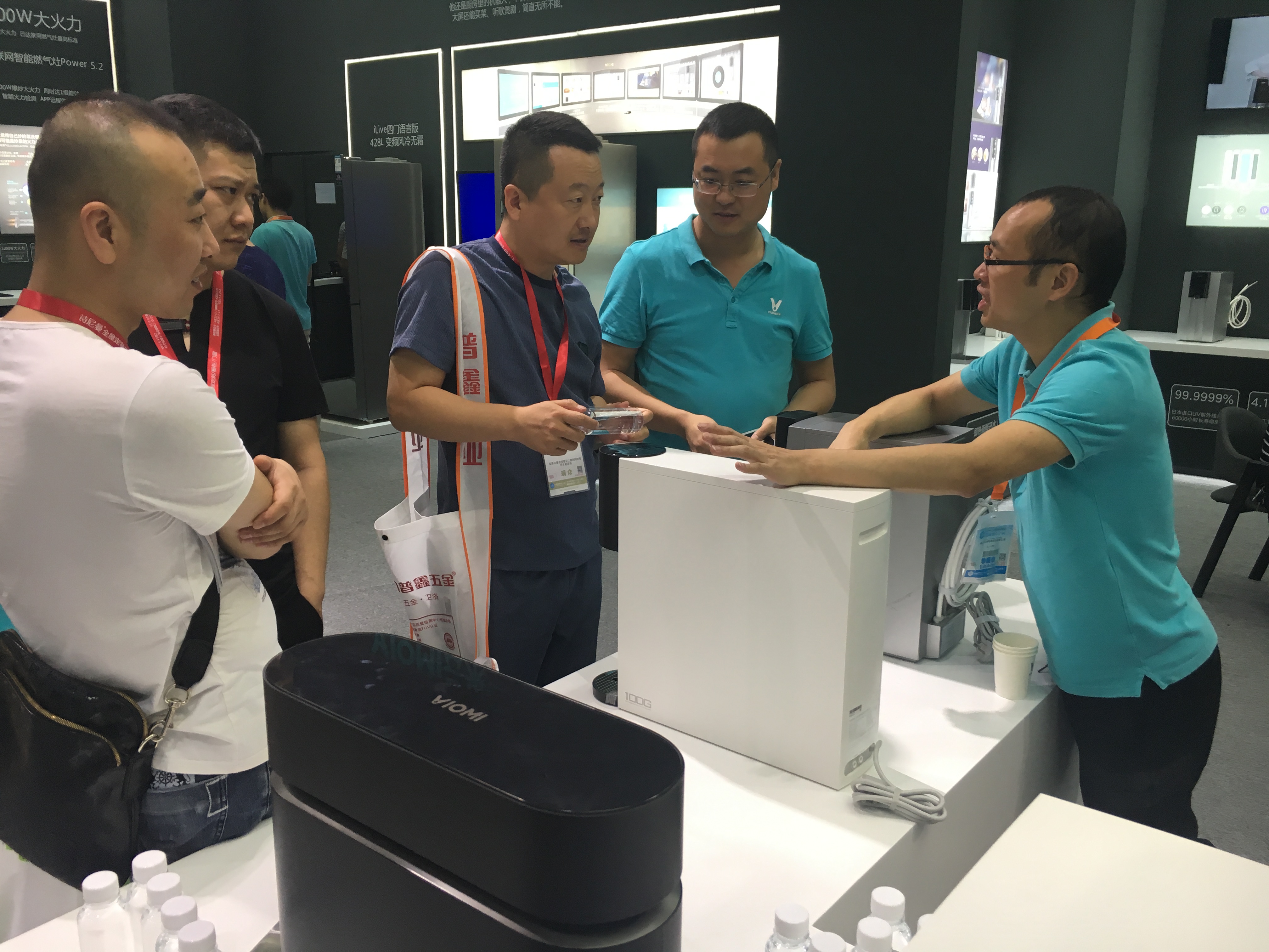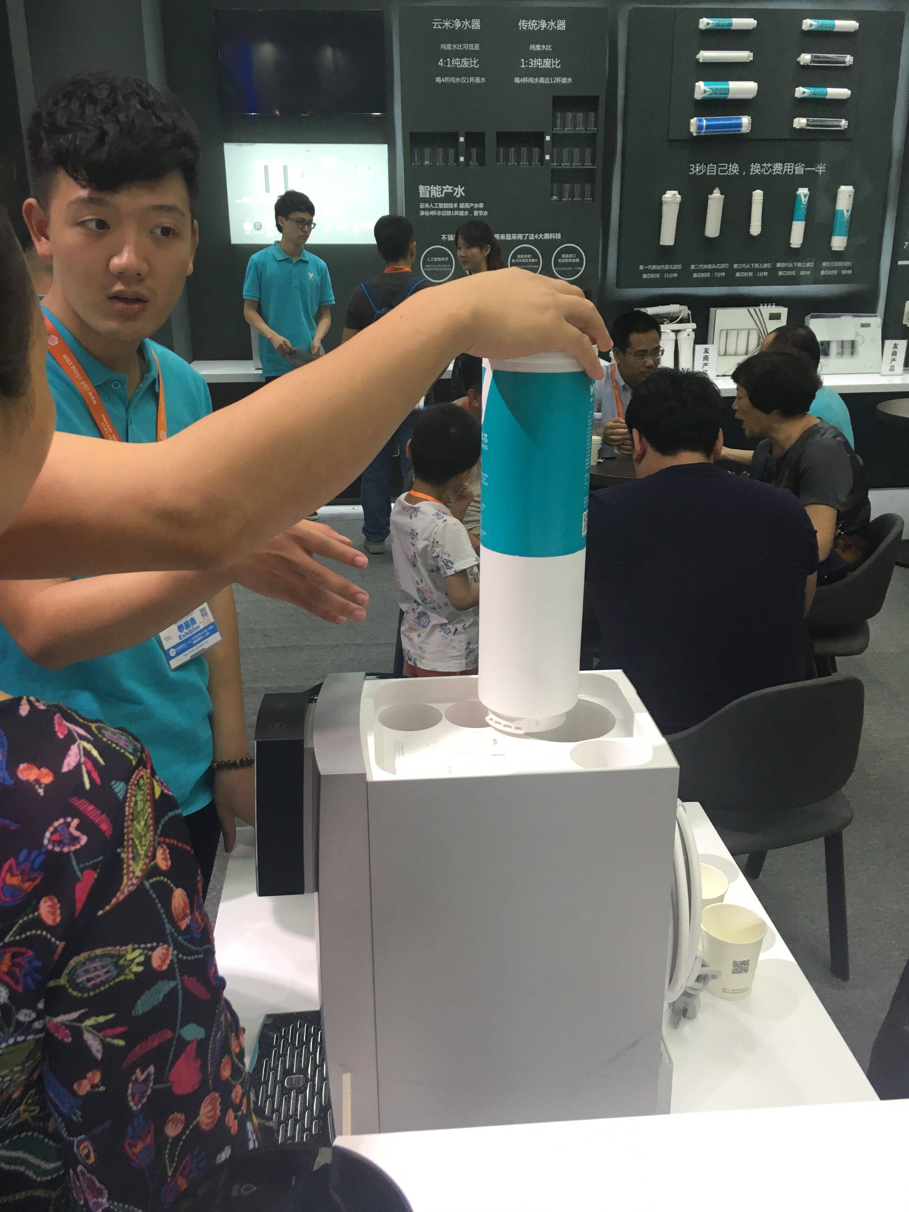 例如,在云米展馆内的人工智能净水器,从人喝水的种种需求出发,一改传统净水器的套路,重新发明净水器。