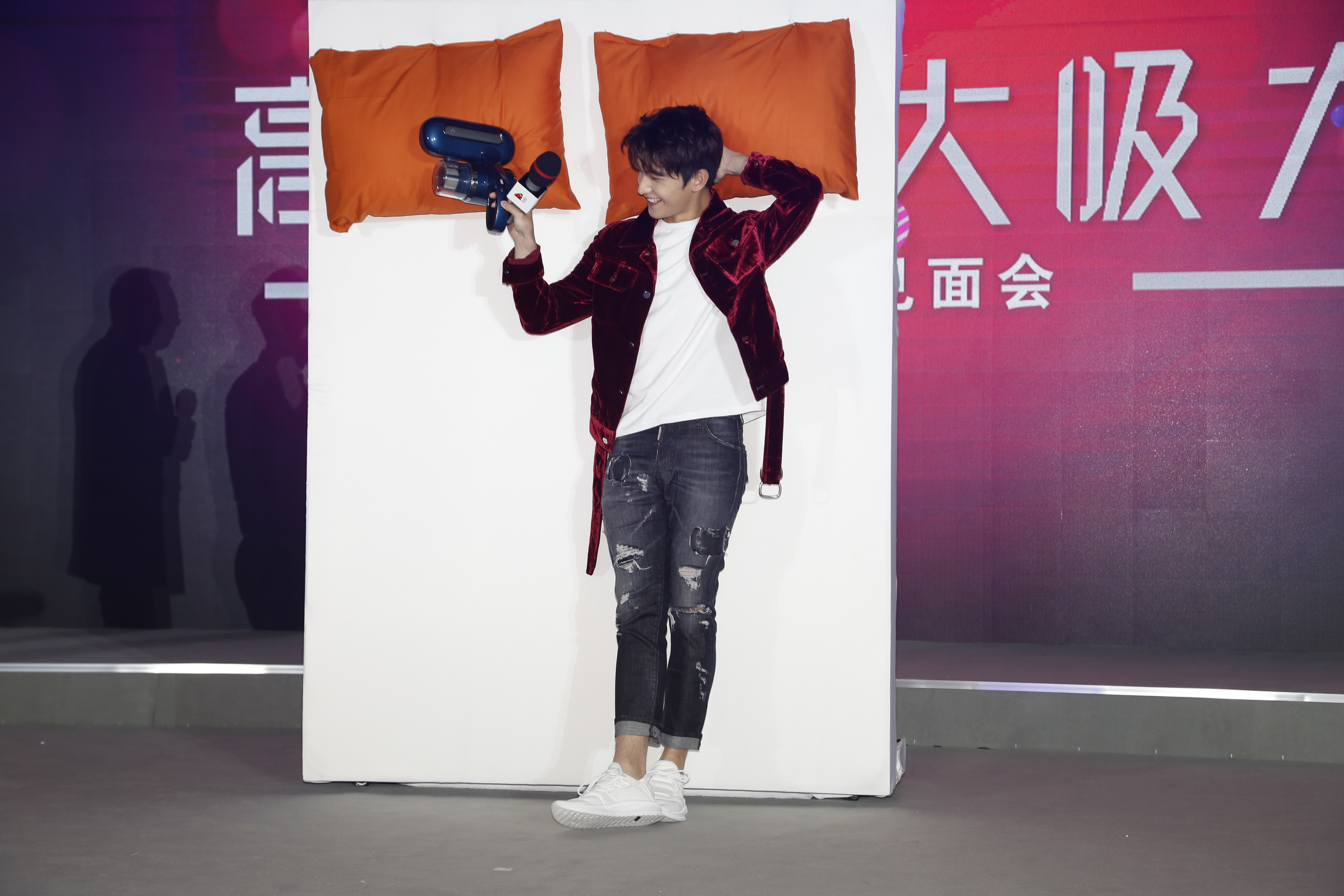 小狗电器代言人杨洋在新品发布会上一袭红衣帅气亮相,与小狗电器创始人檀冲共同发布了新一代高颜值黑科技神器——D-610无线除螨仪。