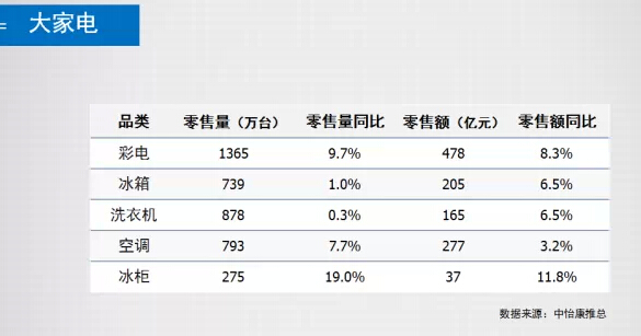 据中怡康数据统计,一季度整体家电市场零售额3717亿元,同比增长6%。