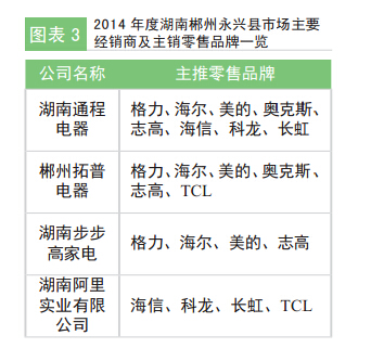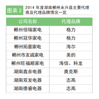 郴州和顺格力电器销售有限公司管辖整个郴州包括永兴县的销售,采取直营大户加专卖店的操作模式。同时,格力专卖店网点在当地市场分布较多。格力在永兴的年销售额约为5500万元。2014年度主要经销商有国美电器、湖南通程电器、郴州恒瑞家电、郴州冠华家电、郴州拓普电器。