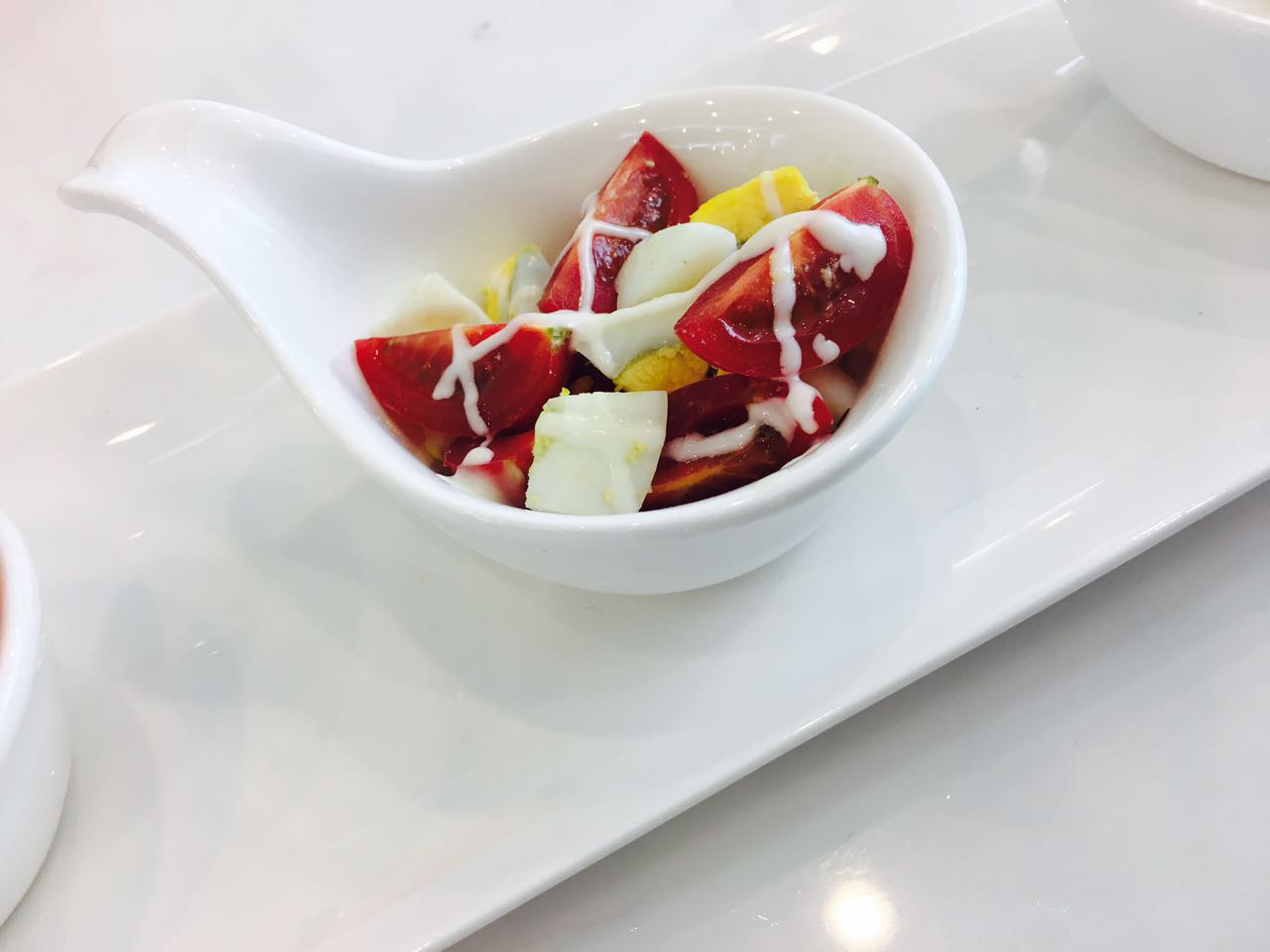 3.将鸡蛋丁、番茄粒混合,加入沙拉酱适量搅拌即可