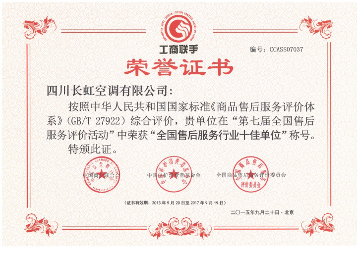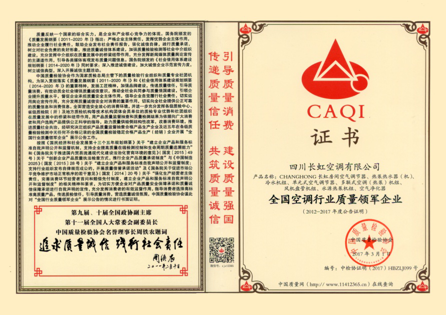 长虹空调一直坚持“诚信、良性、透明”的经营理念,将产品品质放在首位。20余年来,不仅被评选为全国质量诚信标杆典型企业、全国质量诚信优秀企业,更是荣膺2012-2017年度《全国空调行业质量领军企业》荣誉称号。