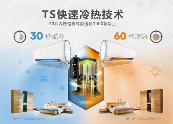奥克斯TS快速冷热技术,30秒内压缩机高频运转3000转以上,启动时间缩短三分之一,风口温度即可达到制冷26℃或制热37℃。30秒速冷、60秒暖房,喝杯水的时间里炎炎夏日立刻清凉舒心,看篇新闻的时间里寒冷冬季立刻温暖如春。奥克斯的速度和品质打破用户对一台空调的固有定义。