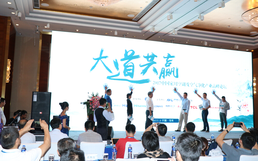 2017年7月13日,由奥维云网和i传媒联合举办的“2017年中国空调及净化产业高峰论坛”在常州马可孛罗酒店顺利召开。本次会议以“大道共赢”为主题,集结行业专家、渠道商、上游供应商、整机企业,围绕家用空调市场竞争、智能化转型、技术升级、产业链变革等,尝试以数据解读空调及空气净化产业2017冷年的走势特点,对下一冷年市场走势进行预判,共同探讨空调行业转型之路,以行业的力量和精英的智慧,碰撞出中国家用空调产业的发展道路。参与本次会议的有海尔、格力、美的、奥克斯、志高、格兰仕、A.O史密斯等主流企业。
