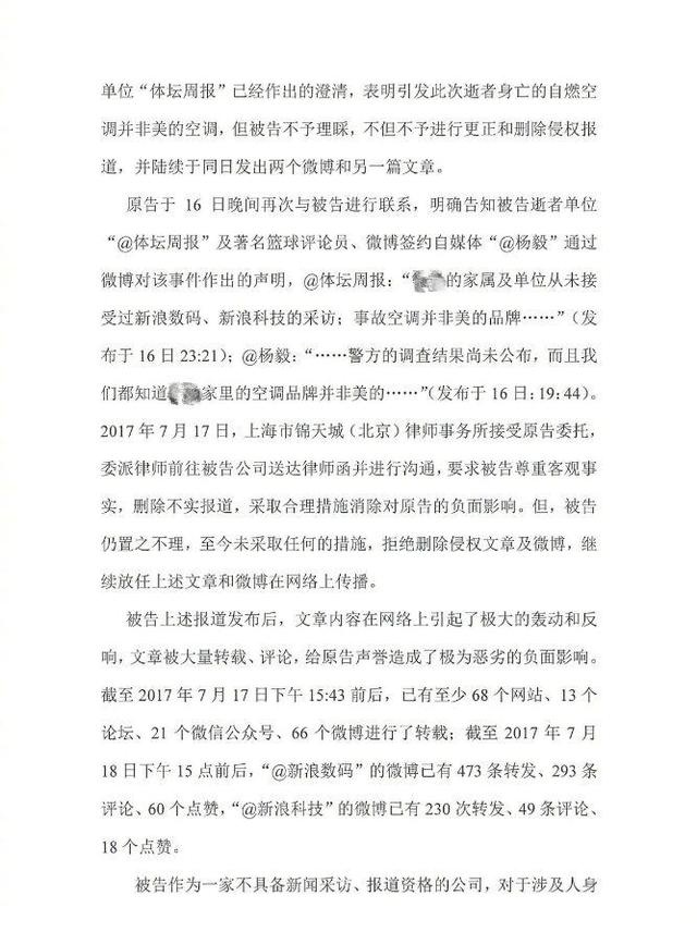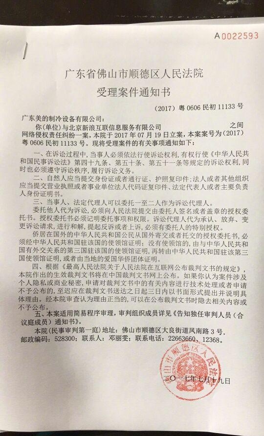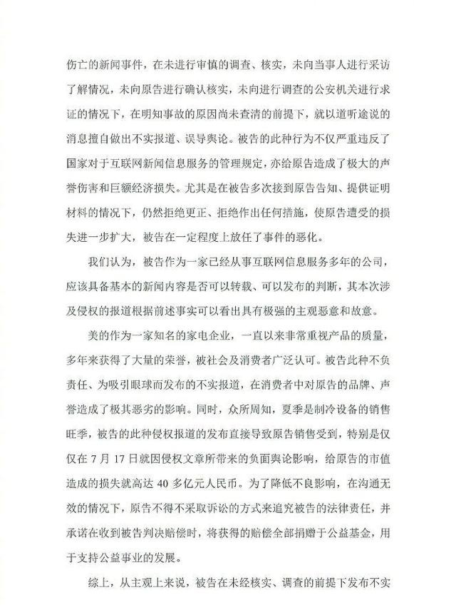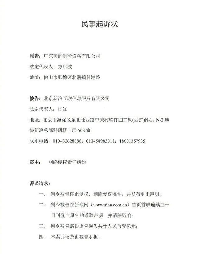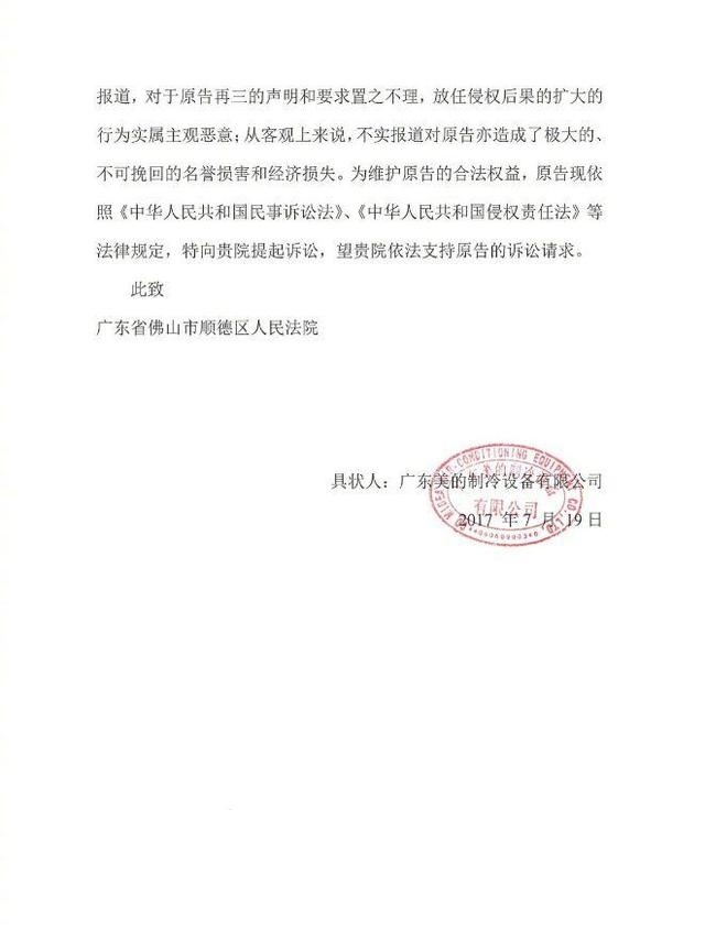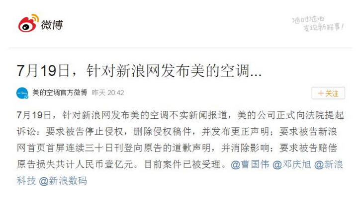 7月19日,针对新浪网发布美的空调不实新闻报道,美的公司正式向法院提起诉讼:要求被告停止侵权,删除侵权稿件,并发布更正声明;要求被告新浪网首页首屏连续三十日刊登向原告的道歉声明,并消除影响;要求被告赔偿原告损失共计人民币壹亿元。目前案件已被受理。