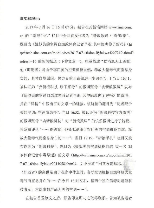 据悉,此次纠纷源于《体坛周报》的篮球记者李淼意外去世事件。7月16日,新浪科技援引体坛快讯消息称,李淼因空调自燃散发毒气引起窒息身亡。随后新浪数码在当日刊登的《疑似美的空调自燃致体育记者早逝其中隐患你了解吗》一文中表示,该记者是由于客厅美的空调机柜自燃,释放大量毒气而窒息身亡的。