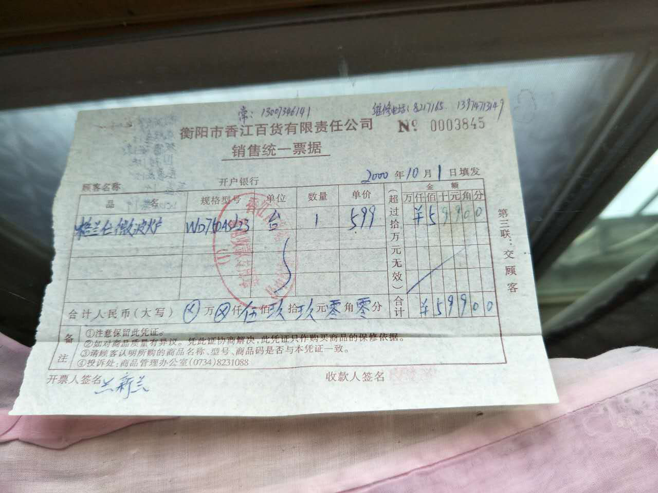 胡阿姨很细心的拍了所有仍完全保留的所有资料。有些泛黄的说明书上用各式符号标注了微波炉安全使用重点。一旁的《格兰仕微波炉食谱》内页不仅有标注,很多页甚至都烂了。发票显示,这是一台2000年购买迄今已经17年的格兰仕微波炉。微波炉很多地方已经泛黄,17年来,除了更换一次高压保险丝,微波炉一直能正常使用。