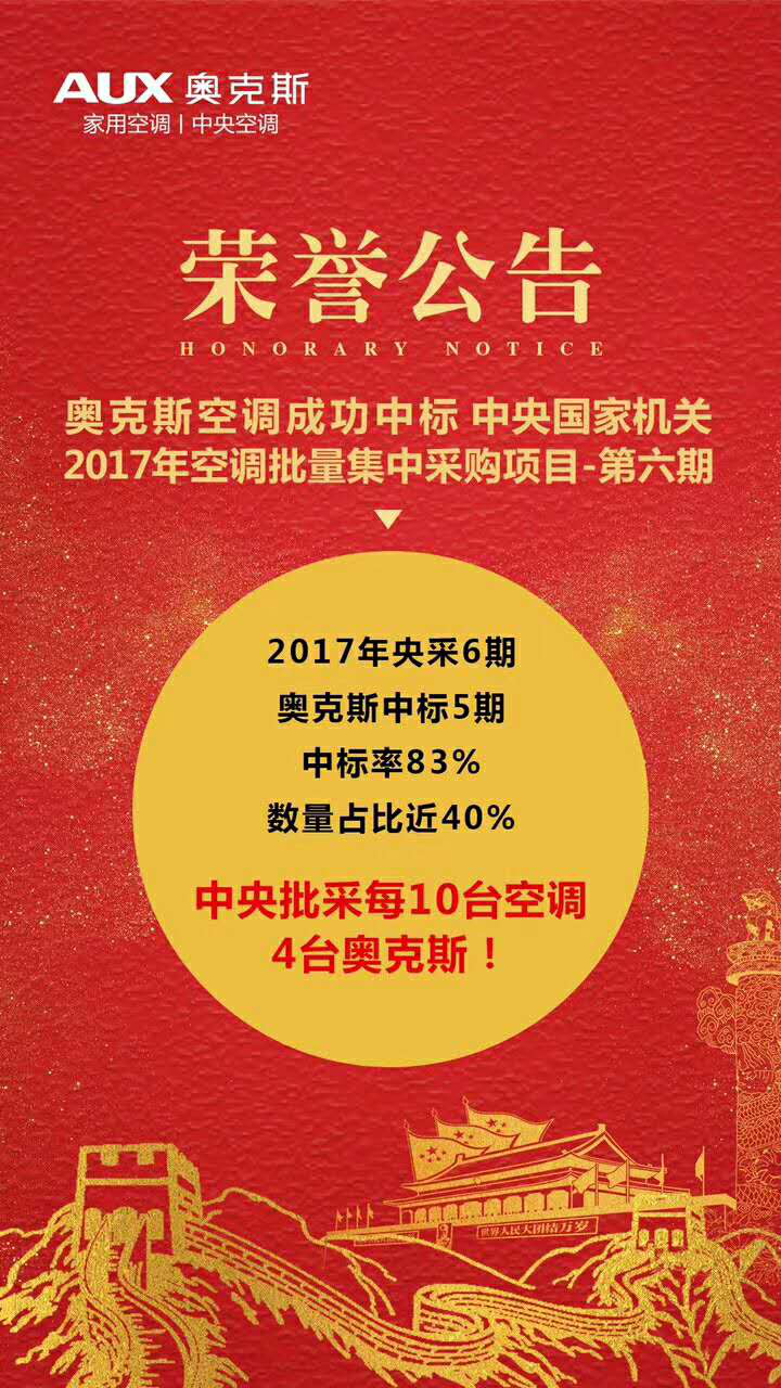 凭借领先的节能技术和过硬的产品品质,奥克斯一直都是各地区政府部门信赖的空调品牌。8月14日,奥克斯空调再度传来捷报,在中央政府采购网发布中央国家机关2017年空调批量集中采购项目-第六期(8月)成交公告中,奥克斯空调中标第二包,并协议供货入围第一包、第二包。2017年央采目前共招标6期,奥克斯中标5期,中标率达83%,其数量占比近40%,也就是说中央批采的每10台空调中就有4台是奥克斯。