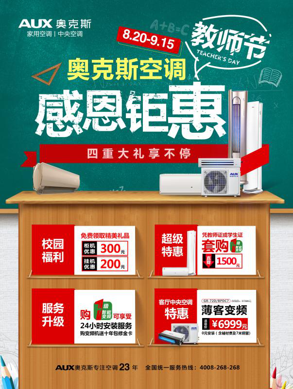 不走寻常路,时刻更新玩法的奥克斯,8月20日——9月15日迎合开学季和教师节推出感恩钜惠大促:Y系列挂机、H系列柜机等明星产品均在促销范围内,在校师生只需凭借教师证、学生证即可完成认购;套购1级变频空调最高可直降1500元;师生微信群发活动内容免费领取保温饭盒等精美礼品;购买1级变频产品享受24小时安装服务和十年包修金卡服务。与此同时,家商一体化的奥克斯为回馈师生,薄客系列变频客厅中央空调只需6999元,享受0元安装。