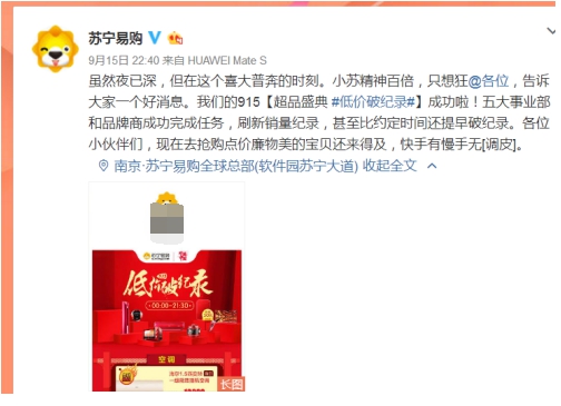 而在9月15日晚上10点40分,苏宁易购官方微博发布“欢腾中国”低价破纪录整体战报:截止至9月15日21点30分, 在不足24小时内,苏宁五大事业部以及家电品牌商提前完成所有目标,并刷新销量纪录。空调、冰洗、彩电、生活电器、厨卫领域均有不俗的表现。
