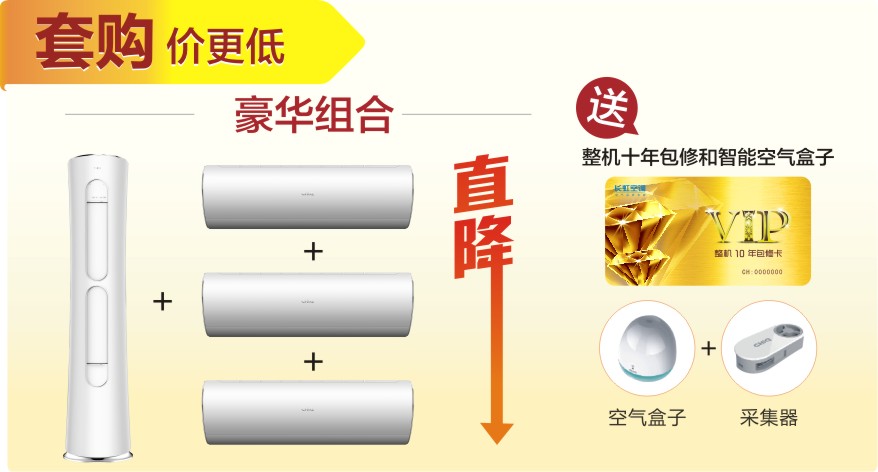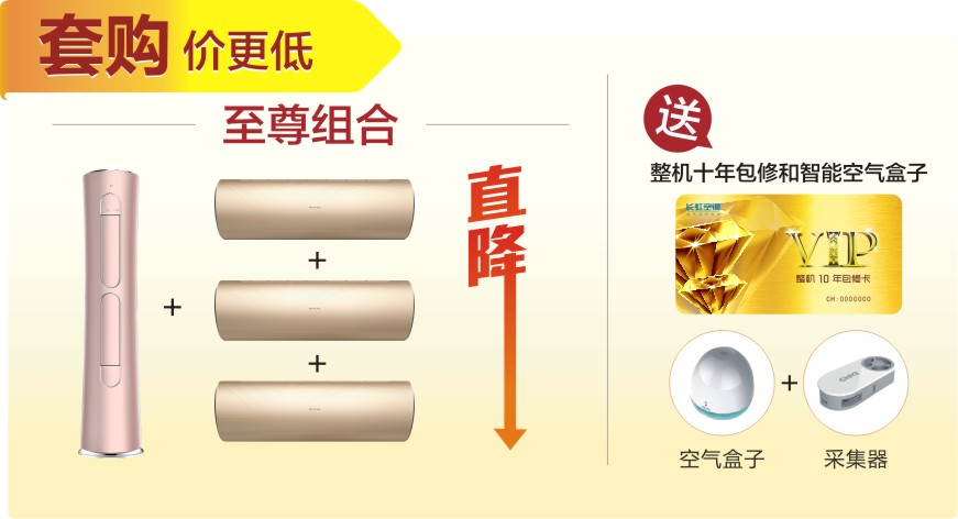 此次长虹空调针对“金九银十”家装季新装用户,推出特惠套购套餐,最高优惠上千元,另送整机10年包修金卡和智能空气盒子,史无前例,一次性把高品质空调全搞定。