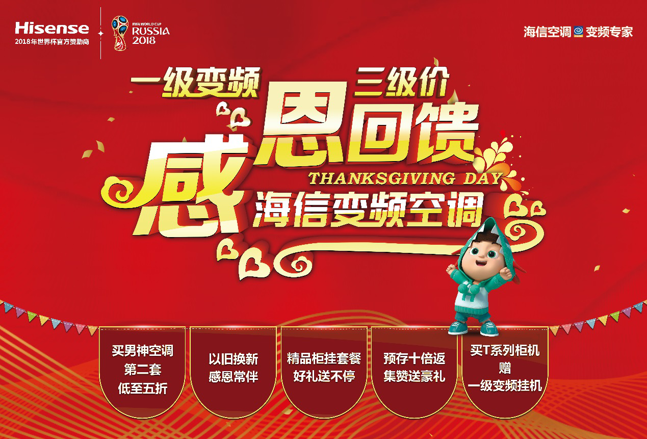 随着简约舒适、绿色环保生活理念的普及,变频空调成为消费者的首选。据中怡康数据显示:2017冷年,海信变频空调销售额占91.4%,高出行业14.1个百分点。为感谢用户的支持,同时更好的满足人民日益增长的美好生活需要,感恩节期间,海信空调推出“一级变频三级价,海信变频空调感恩回馈”活动。