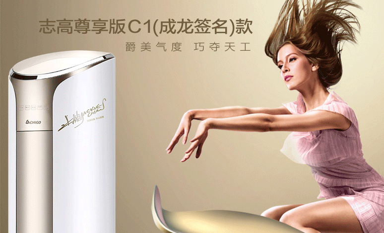 在外观方面,志高C1款的设计源自于雅典卫城灵感的柱式机身,圆润机身,整体摩擦系数小,保护性高,不易损坏。颜色方面,大胆地采用香槟金和珠光白作为整体颜色,内机香槟金的机身,被一层珠光白的外壳所包裹,免去了单一色调带来的单调感,同时也呈现出典雅的尊贵气质。机身上部为显示及按键区域,采用隐藏式设计,搭配银色的志高logo,保证了机身的简洁。机身中部为出风区域,出风时风门向左内收,风从中部吹出,底部金色地盘柔和的铺开,增强机身稳定性。