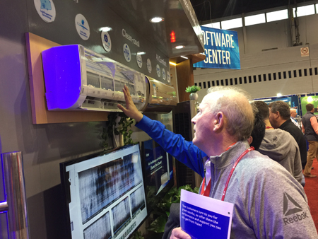 举例来说,GE Appliances智能窗机可与谷歌助手、亚马逊Alexa音箱互联,并支持苹果HomeKit平台,打造共创共赢的智慧生态。在展会现场,一位美国用户Thomas体验了通过语音助手Geneva控制智能空调。Thomas对着Alexa音箱下达了指令:“Geneva,调高空调温度”。通过交谈,空调被设置为制热模式、温度调整到舒适的26℃。在现场,海尔展示了净界自清洁空调一束光演示。在一间充满高浓度PM2.5的密闭玻璃房内,净界自清洁空调开机3分钟即可吞掉形成“雾霾”的光束,净化效果媲美专业空气净化器。