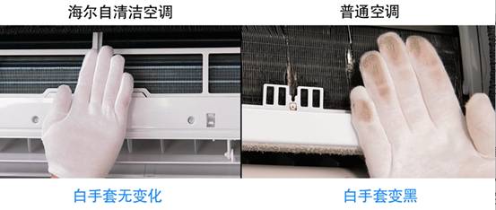 视频中,海尔空调服务工程师分别清洗了一台海尔自清洁空调和一台普通空调。打开空调面板,用白手套擦拭海尔自清洁空调蒸发器,白手套无变化,蒸发器翅片缝隙间无肉眼可见的灰尘;普通空调因为长期附着的污垢,蒸发器表面严重变黑,擦拭后染黑了清洗人员的白手套。同样在启动高压蒸汽清洗设备后,视频中左右两侧画面中的差异更加明显:海尔自清洁空调清洗透明的清水;普通空调洗出一盆黑色的污水。