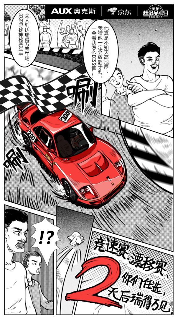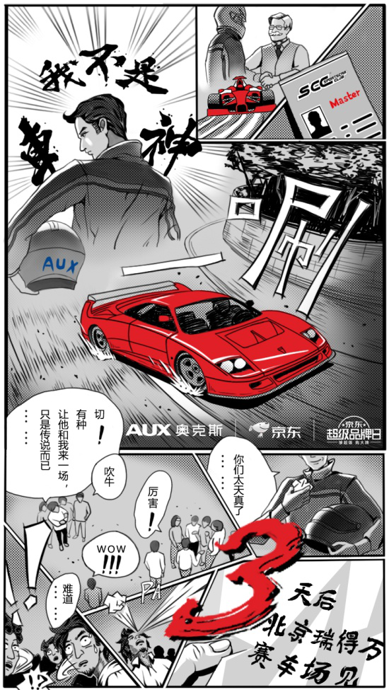 除了携手京东、SCC外,本次AUX超跑红竞速趴暨8.1奥克斯京东“超级品牌日”发布会还别出心裁地采用漫画倒计时的方式进行宣传。用来作为宣传的漫画名叫《我不是车神》,漫画总共由三幅构成。