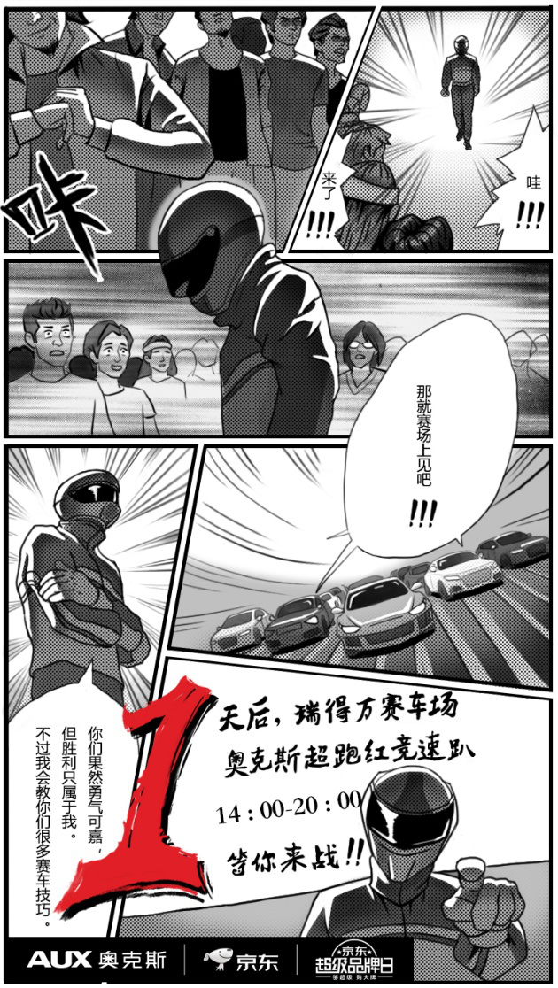 第一幅漫画是一位头盔上有AUX(奥克斯)字样的不知名赛车手,他驾驶着一辆超级跑车出现在赛场上。人群中有人对他的技术提出了质疑,于是这位赛车手向那位挑战者发出了挑战邀请函:3天后,北京瑞得万赛车场见。