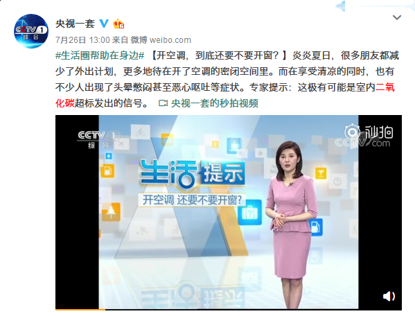 在使用空调时,大家都会有这种感受:空调长时间运行,室内空气会变得浑浊。在央视1套综合频道播出的《生活提示》栏目中,就对空调房室内空气问题进行了检测实验,2名实验员在13平米的小卧室中,关闭门窗开空调仅1小时,二氧化碳浓度就从472ppm升至2088ppm,而且还在不断升高。节目中,央视《生活提示》给出建议,开空调1小时开窗通风一次,或者另外购买新风机。笔者发现,央视新闻已经连续2年对这一问题进行了专题报道。