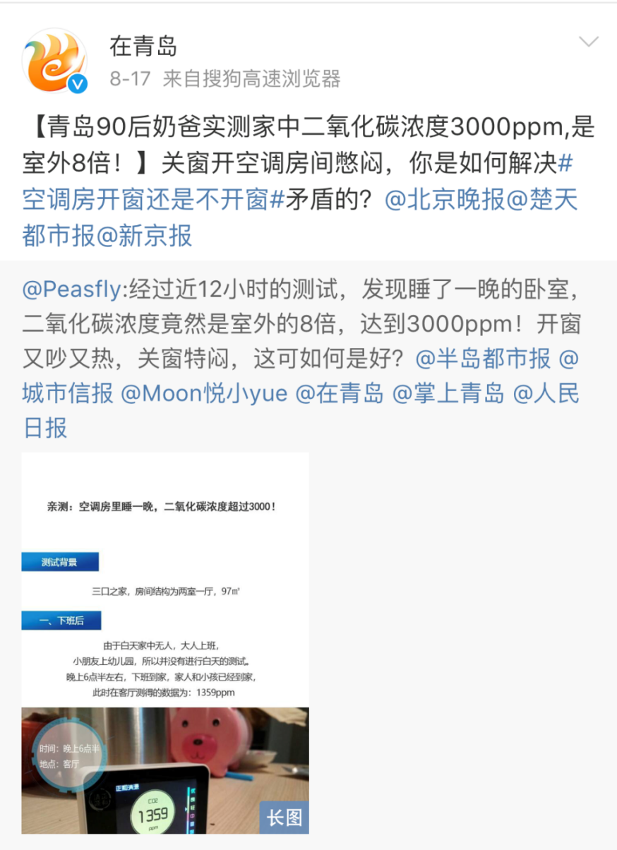 8月初,网友@Peasfly也在自家做了关窗开空调的实验测试,一晚上关窗开空调,早上室内的二氧化碳浓度超过3000ppm,相当于室外的8倍。这也证实了空调房空气不流通会导致呼吸不适。其实,开空调要不要开窗在网络上的关注度一直很高,通过百度搜索“开空调开窗”词条,相关信息达到477万余条。