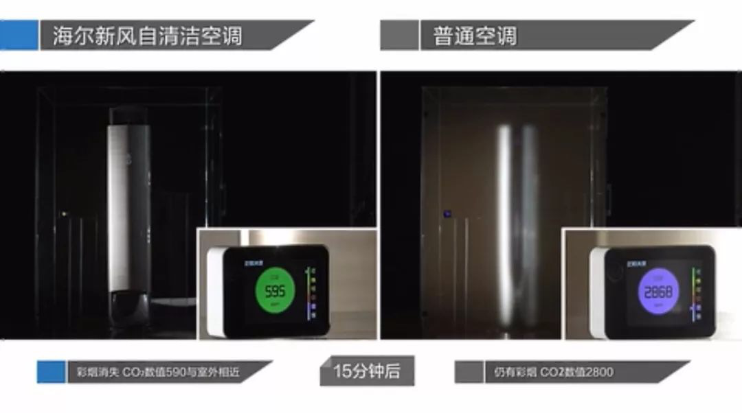 此外,笔者通过一段对比视频也了解到这款产品的优势。在同样的玻璃房中,普通空调无法换新空气,二氧化碳浓度始终保持在3000ppm左右。而在海尔新风自清洁空调玻璃房中,打开空调后,室内空气在15分钟内,二氧化碳浓度即从3000ppm降低至595ppm,达到优质空气指标。