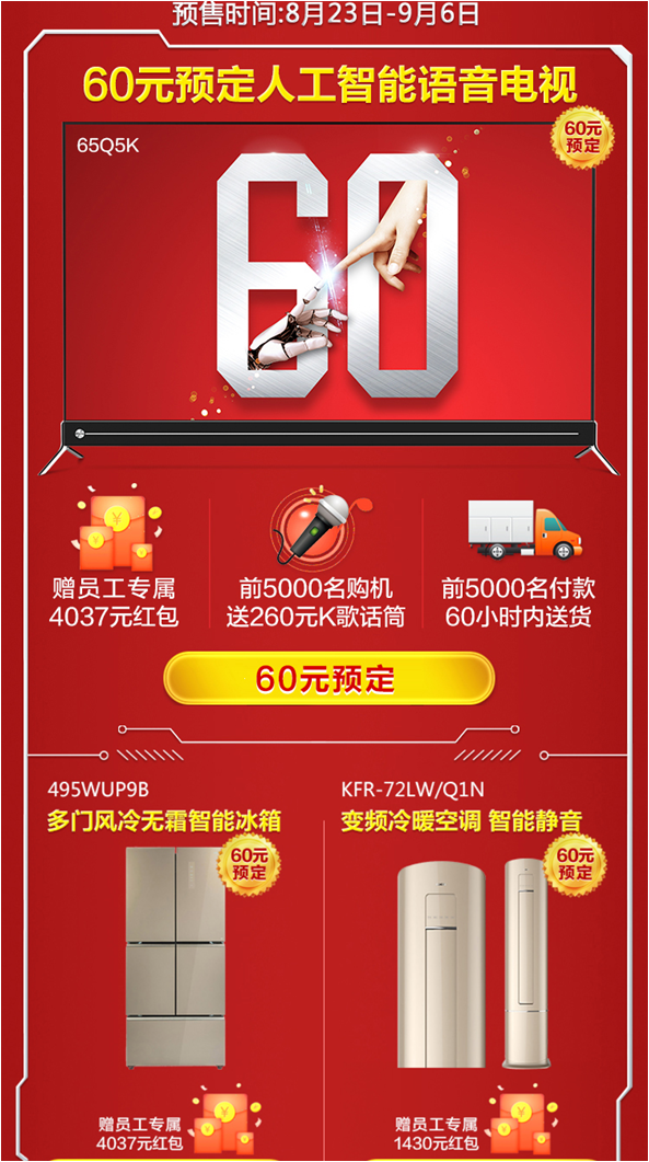 2018年恰逢长虹建业60周年,长虹美菱以旗下超级价值与品质的长虹彩电、美菱冰箱、长虹空调、长虹小家电产品,感恩回馈广大员工及亲朋好友对长虹美菱的付出与支持。董事长赵勇先生还向每个员工发出超过4000元的超级大红包2个,超千元的超级大红包若干,让长虹美菱员工能够享受长虹旗下高端CHiQ系列产品。此外,长虹美菱员工还能专享虹6大尊享服务。