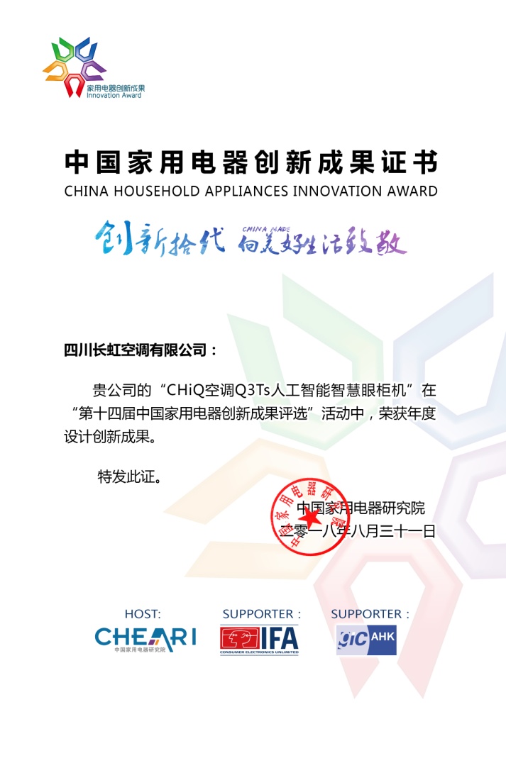众所周知,IFA 展每年都吸引了全世界众多知名品牌和最创新的科技产品参与,它所带来的不但是各行各业最新、最潮、最具吸引力的产品,还是各大行业的潮流风向。由中国家用电器研究院主办、柏林国际电子消费品及家电展览会德国工商会支持的享誉全球的“第十四届中国家用电器创新成果推介”活动于IFA展会开幕当天同期举行。从2005年至今,“中国家用电器创新成果推介”活动已经成功举办十四届,致力于将中国家电最具影响力、最具竞争力的创新成果带上国际舞台,让全世界近距离了解并认可中国家电企业的创新实力。长虹CHiQ 空调Q3Ts人工智能智慧眼柜机在本次“中国家用电器创新成果推介”活动上大秀技术与功能创新设计实力,得到专家评委的一致认可,荣获“年度设计创新成果”奖,通过IFA这个世界级大舞台,为中国“智”造续写荣誉,向世界传递出长虹空调品牌卓越的设计创新能力。