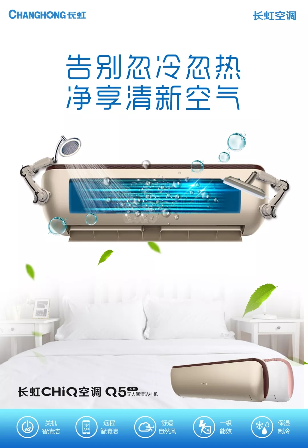 对于空调,我们的日常生活已经离不开它;对于病菌,我们希望它们早早离开。因此,空调清洁的问题正被人们正视,定期清洁空调的概念已经深入人心。但是如何清洁空调依旧是个大麻烦。很多人认为空调还是由人工清洁较好。但人工清洁空调是一个技术含量极高的活儿,不仅耗时长、费用高,更需要专业清洁人员具备专业知识。所以,哪怕请来的工人忙活上大半天,清洁效果到底如何还是要打上一个问号。因此,空调行业各大品牌的自清洁空调应运而生,各领风骚。长虹CHiQ空调Q5系列无人智清洁空调,以独特的设计理念、良好的清洁效果和舒适的使用体验,后来居上,成为消费者更好的选择。