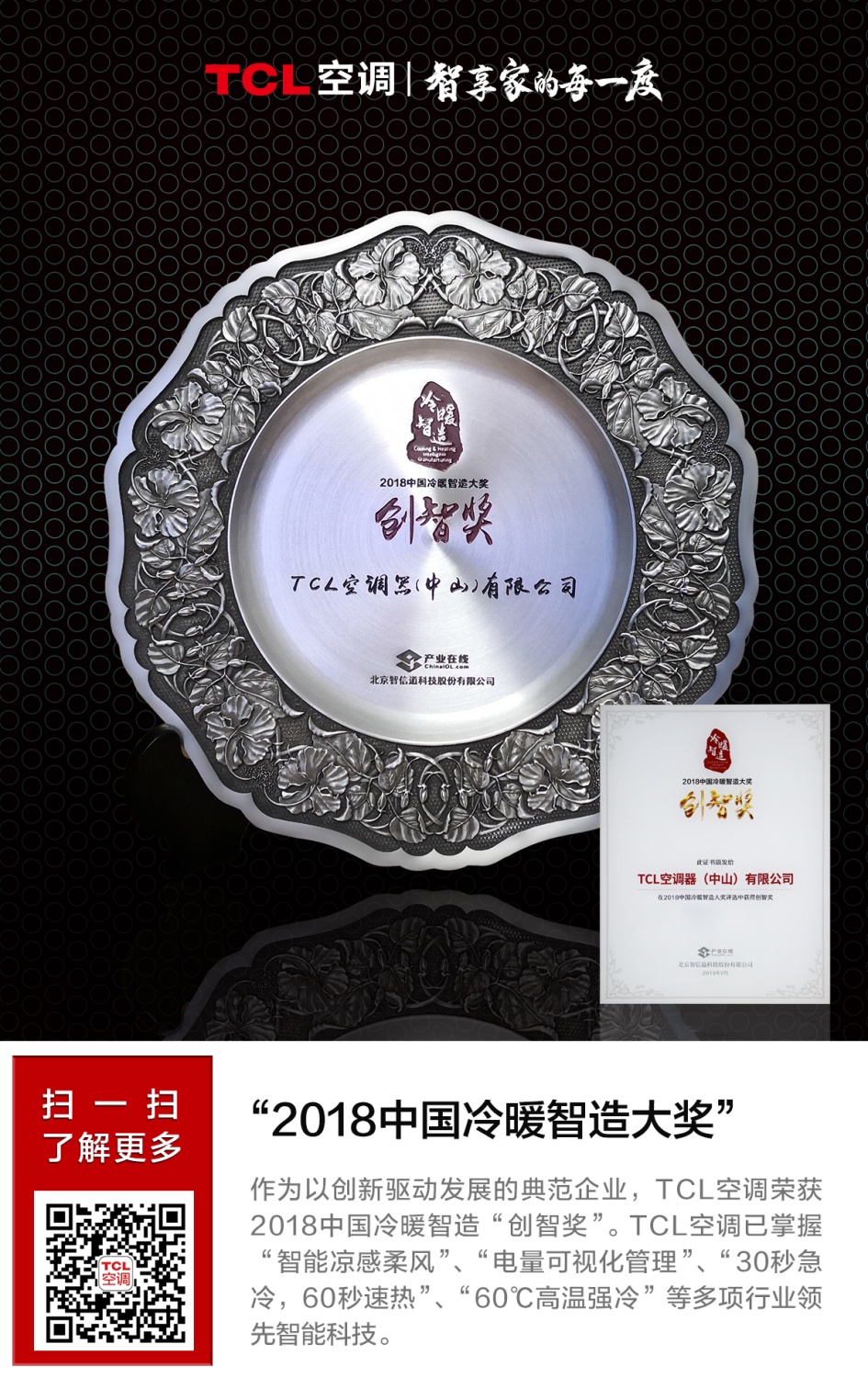 作为以创新驱动发展的典范企业,TCL空调荣获2018中国冷暖智造“创智奖”