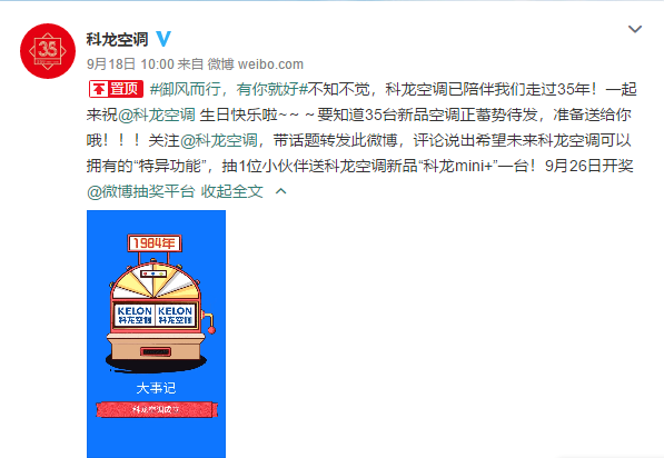 9月18日,科龙空调官方微博正式带35周年话题#御风而行,有你就好#发起转评送科龙“mini+”新品空调的活动,吸引了青岛啤酒、中国联通、百雀羚等34家蓝V的加入,使得话题量迅速攀升。35家蓝V的齐声造势,共同助力科龙35周年庆典营销战,打造热门话题,深入微博用户,提升周年庆与品牌曝光量,增强品牌认知度与巩固品牌形象,获得市场关注,推动科龙35周年庆活动的落地。