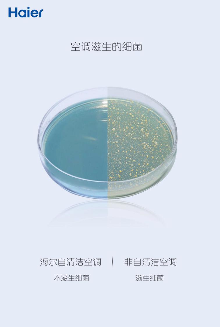 那么,空调几年不洗,蒸发器会滋生多少细菌?第三张实拍图片反映出自清洁空调与非自清洁空调蒸发器本身的细菌测试结果。分别对两台空调蒸发器取样、细菌培养后发现,海尔自清洁空调不滋生细菌,而非自清洁空调培养皿中布满黄色和乳白色细菌。