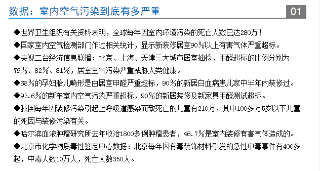说到健康绿色生活,大家首先会想到环保低碳的生活方式或是绿色健康的饮食等等,其实不然。健康绿色生活还包括了纯净、健康的室内生活环境。我们绝大部分时间都在室内度过,室内的空气环境若遭受家装污染,对于人体的损害极大。轻则引起头晕、头痛、胸闷等症状,重则引发再生障碍性贫血、肺癌等重大疾病。