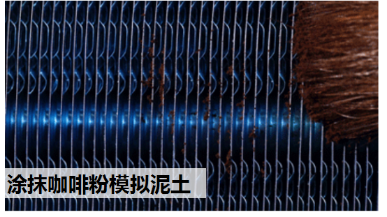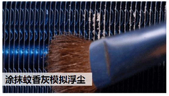 第一关,实验人员采用蚊香灰来模拟空气中浮尘,用刷子将蚊香灰涂抹在空调蒸发器翅片上挑战清洁能力。启动空调自清洁功能后,空调蒸发器经过冷凝水结霜、化霜,蒸发器翅片上的蚊香灰被冲洗干净,空调蒸发器翅片恢复到原本的宝石蓝颜色,说明挑战成功。