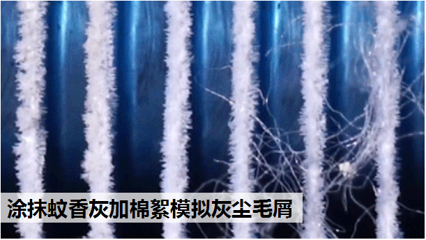 第三关“极限挑战”难度再次升级,实验员将蚊香灰与棉絮混合,模拟空气中的灰尘和毛絮,并用刷子涂抹在蒸发器翅片上。空调开启自清洁后,可以看到蒸发器上的蚊香灰和棉絮被清洗干净,蒸发器恢复原本宝石蓝颜色,挑战再次成功。