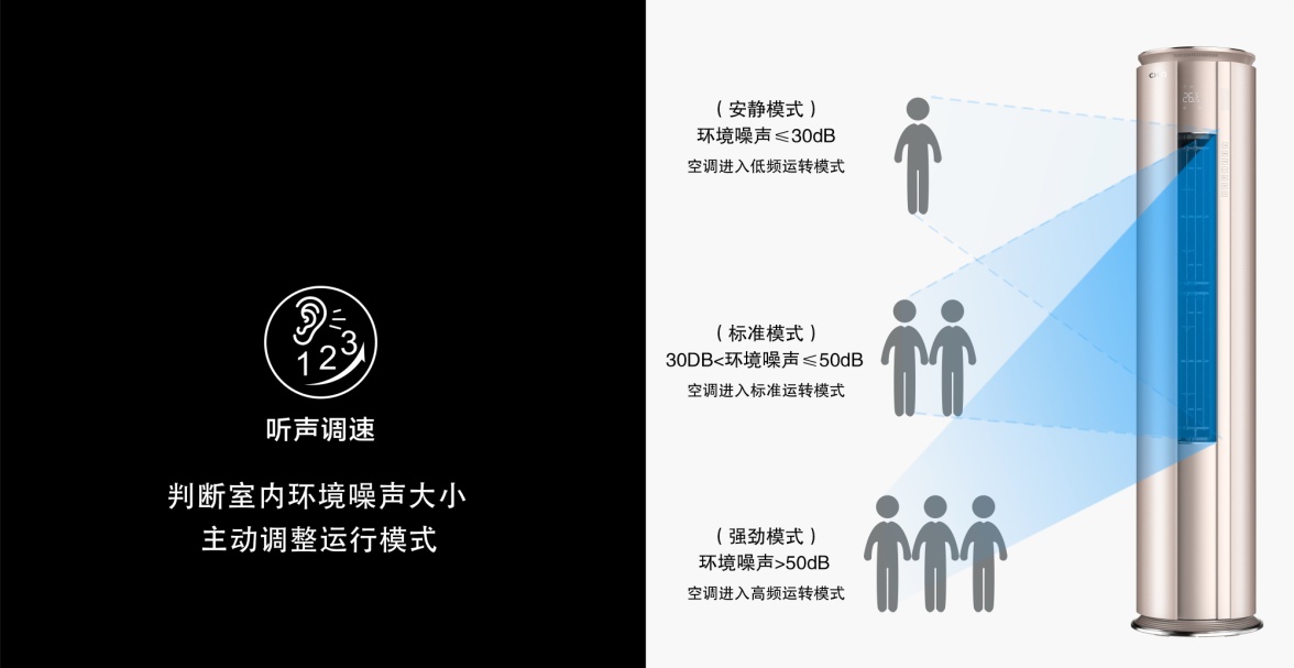 长虹CHiQ空调Q5Ds、Q5Gs系列AI人工智能空调通过创新的“声纹感控”技术,具备“识人”能力,根据声量判断室内噪声大小,主动调整运行模式。在环境噪声≤30分贝时,空调自动进入低频运转模式;在环境噪声在30-50分贝之间时,自动进入标准运转模式;在环境噪声≥50分贝时,自动进入高频运转模式,满足不同场景所需。