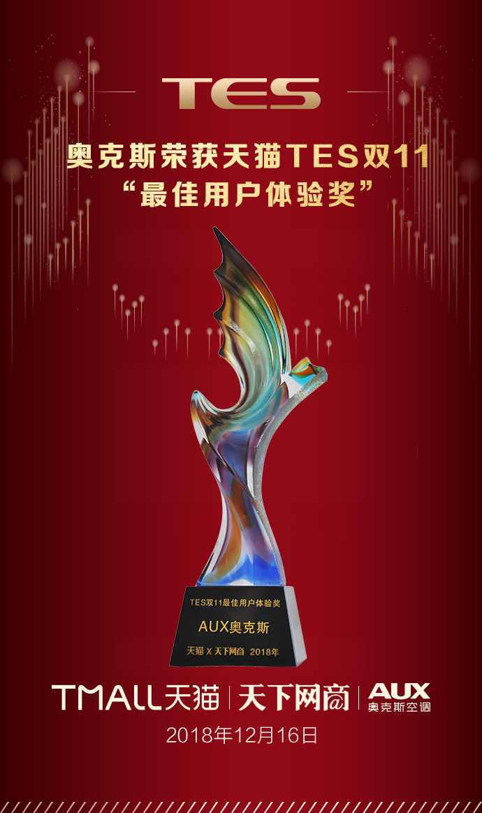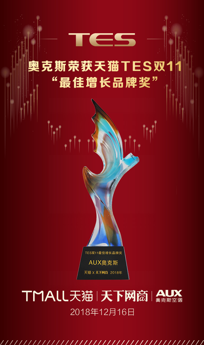 不负众望,奥克斯又一次与华为、戴森等品牌一起斩获天猫TES大奖,分别获得了“最佳用户体验奖”和“最佳增长品牌奖”,这是继今年5月TES获“年度最佳用户体验奖”和“年度最佳人气品牌奖”与8月TES“最佳创新突破奖”后全新的2个重量级奖项,是对奥克斯在天猫双11表现的认可,也是消费者对奥克斯品质的信任。