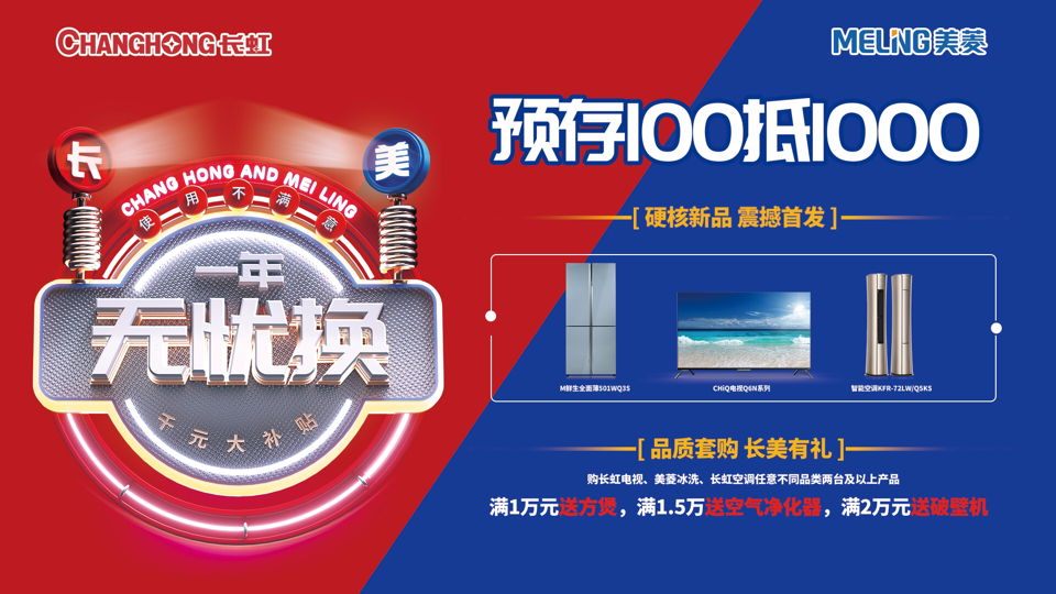 据长虹相关人士透露,这次不仅有“一年无忧换”的售后服务活动,还将同步开展“千元大补贴”,预存100元抵1000元、新品促销活动、套购有礼活动等。同时长虹·美菱国货潮品节也即将上线,这将成为长虹·美菱合体后让利给消费者最大的一次促销活动。