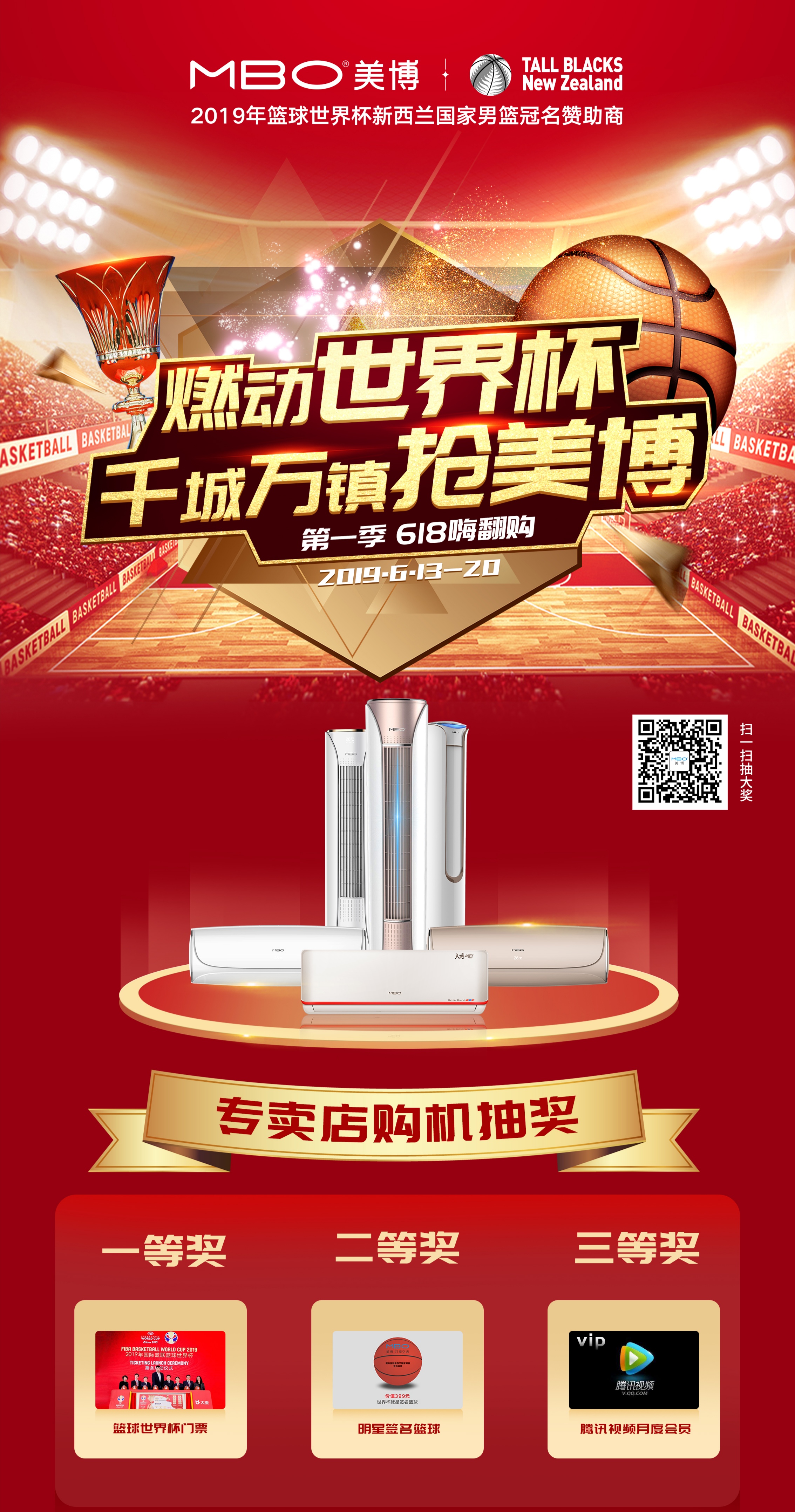 活动期间,用户不仅可以享受轻奢派、急冷王、天柱等产品的超级优惠,同时还可以参与美博“篮球世界杯”的抽奖活动。“凡是购买美博空调的用户都可以参与抽奖活动。”美博空调相关负责人介绍:“作为2019年篮球世界杯新西兰国家男篮官方赞助商,我们准备了世界杯门票、明星签名篮球以及腾讯视频月度会员的福利。”