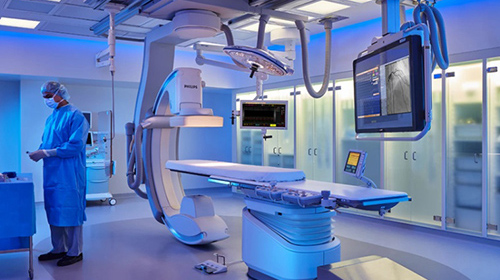 在美国芝加哥路德综合医院,一名仪器设备操作员正在为一场心脏导管手术做准备。在他身边,是一台术中三维CT扫描导航设备,其提供商来自飞利浦,一个以护理型家电和黑电产品广为人知的