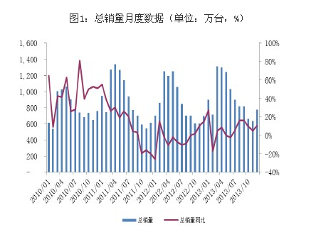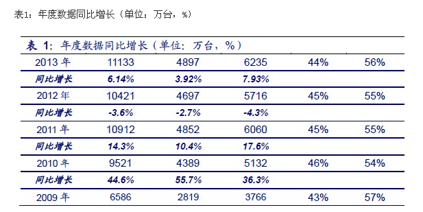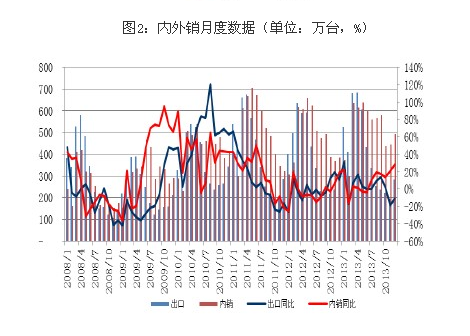 2013年全年,行业总出货量11133万台,同比上涨6.8%;其中,内销6235万台,同比上涨9.1%,出口4897万台,同比上涨4.3%。